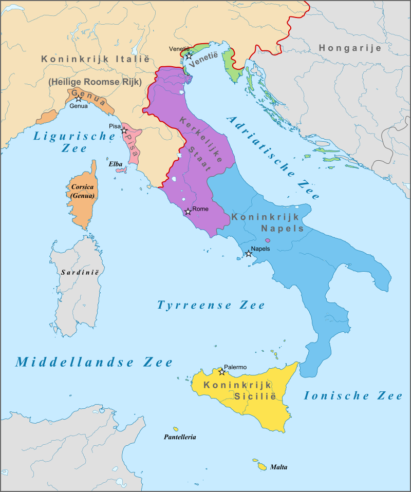 Italië bestond in de middeleeuwen nog uit veel meer afzonderlijke stadstaatjes die niet op de afbeelding te zien zijn.